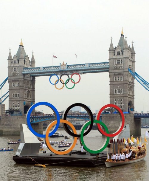 The Olympic Torch Relay, on the River Thames, under the giant Olympic Rings